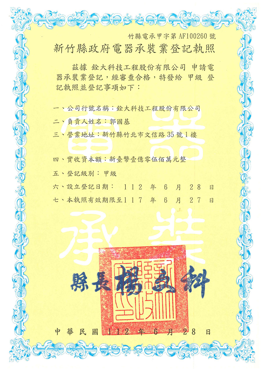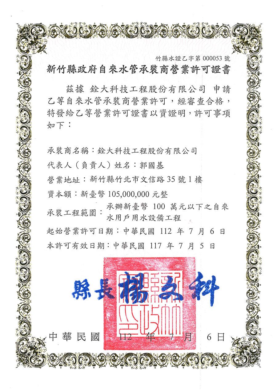 Chuan Ta Technology Corp. won the Hsinchu County Government Water Pipe Dealer Business License